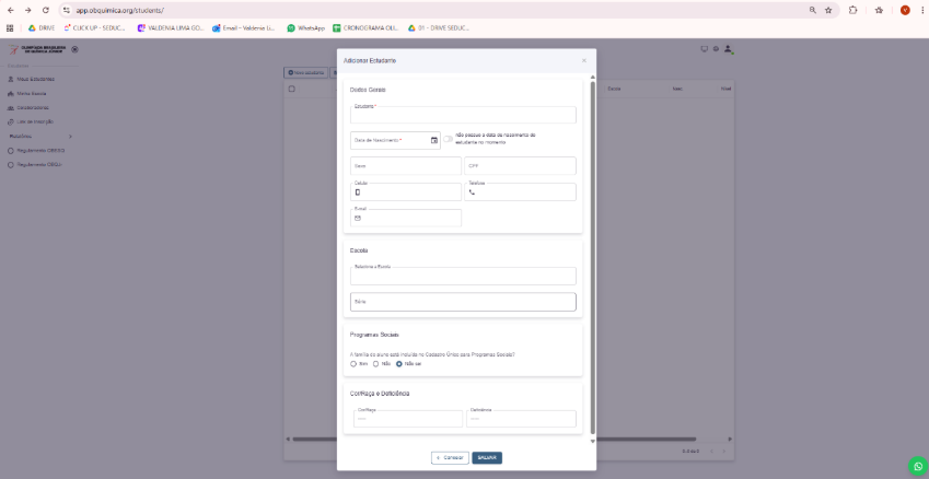 Ao clicar em “Novo Estudante”, será aberto um formulário para preenchimento dos dados de um aluno por vez.