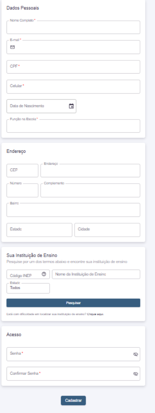 Ao clicar em “Cadastre-se”, será exibido um formulário em etapas. Nele, você deverá preencher seus dados pessoais, endereço, informar a instituição de ensino (digitando o nome da escola ou o Código INEP, clicando em “Pesquisar” e selecionando corretamente a escola) e, por fim, criar seu login e senha de acesso.